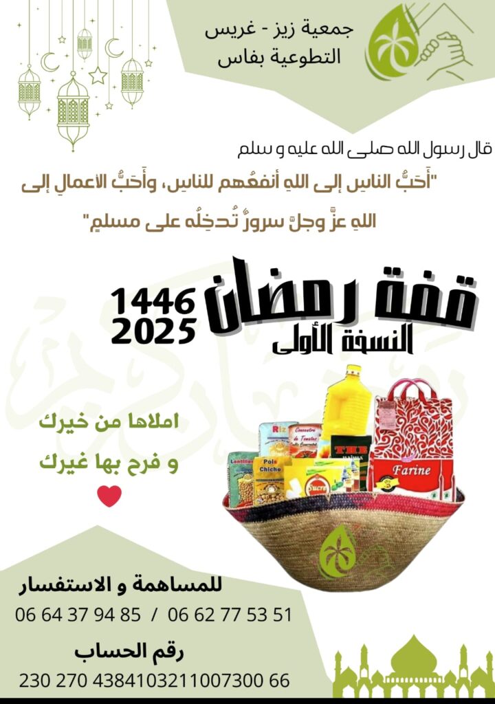 سعيا منا لتعزيزقدراتنا وتطوير كفاءاتنا في المجال الخيري كان حري بنا أن نبادر لخوض تجربة ميدانية نحاول بها مساعدة الناس المحتاجين والفقراء ووعيا منا بضرورة تفعيل مبادئ القانون الأساسي للجمعية فكانت مبادرة قفة رمضان والتي انجزناها ابان شهر رمضان الكريم ،كانت وجهتنا الأولى كنوع من التحدي كوننا جمعية فتية انتقلنا إلى مدينة أرفود لانجاز هذه المبادرة عملنا لم يكن سهلا ،كان ضروريا اختيار المستفيدين بعناية والتي يجب أن تتوفر فيهم عدة شروط مثلا الارامل والمعاقين وذوي الاحتياجات الخاصة ،كما حرصنا تجنب الإشهار اثناء توزيع القفف وعدم احراج المحتاجين وذلك بتكليف بعض ذوي الثقة لايصال القفف لسكنى المحتاجين ،الحمد لله توفقنا في توزيع أكثر من274 قفة،وكما لا ننسى أن نشيد بالتبرعات التي توصلنا بها من ذوي الاحسان تقبل الله من الجميع، والله لا يضيع اجر من احسن عملا.