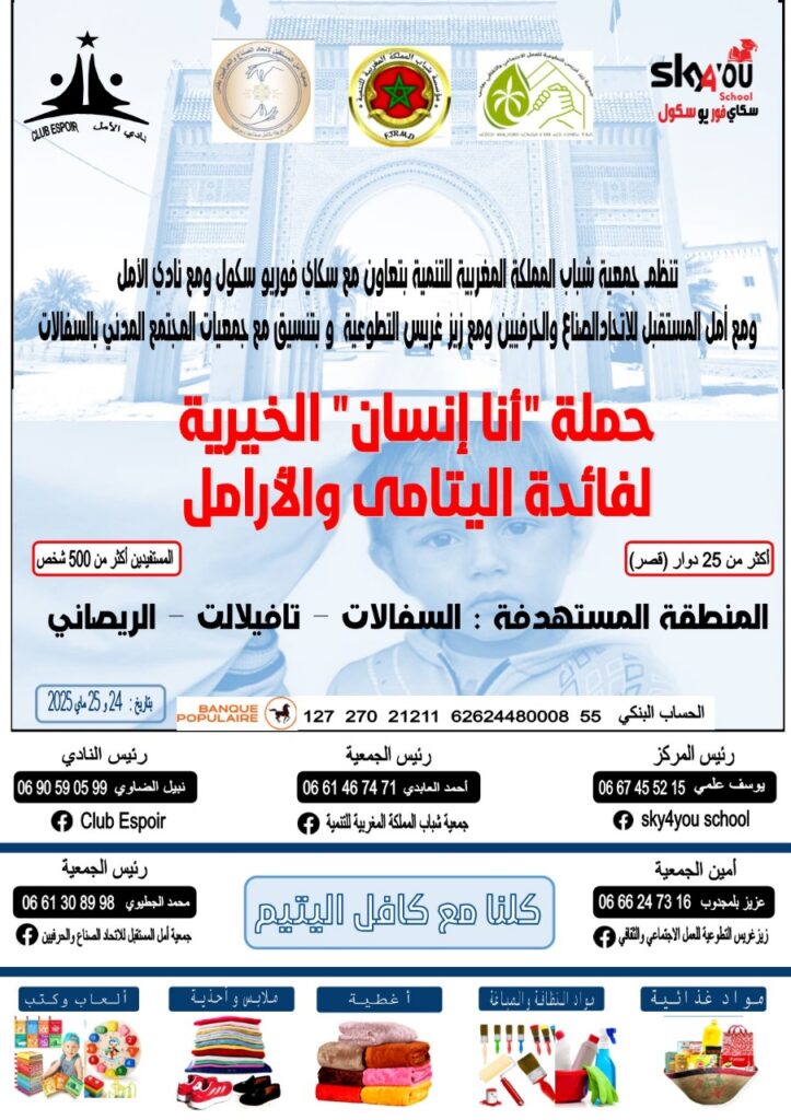 الانجاز الآخر الذي حققناه والحمد لله في هذه الجمعية هو مشاركتنا مع بعض الجمعيات في تنظيم حملة أنا إنسان الخيرية ،هذه الحملة ايضا كان وجهتها الجنوب الشرقي وتحديدا جماعة السفالات بالريصاني ،كان هذه الحملة استفادة أزيد من 450 أسرة محتاجة وفي وضعية هشة بقفة غذائية وقفة للملابس ابان اجواء عيد الاضحى ،انتقلنا جميعاً برفقة اعضاء الجمعيات المشاركة إلى المنطقة ،وكما حرصنا على اختيار والتنقيب على الأسر المحتاجة حرصنا على توزيع القفف ،وتميزت المبادرة بأن تم إقامة حفل للاطفال بمؤسسة تعليمية بالمنطقة تم توزيع اثناء الحفل جوائز على اكثر من 70 تلميذ وتلميذة متفوقين في دراستهم ،كما لا أن نشكر وندعو أن يتقبل الله من كل من ساهم من قريب أو من بعيد لانجاح وانجاز هذه المبادرة.