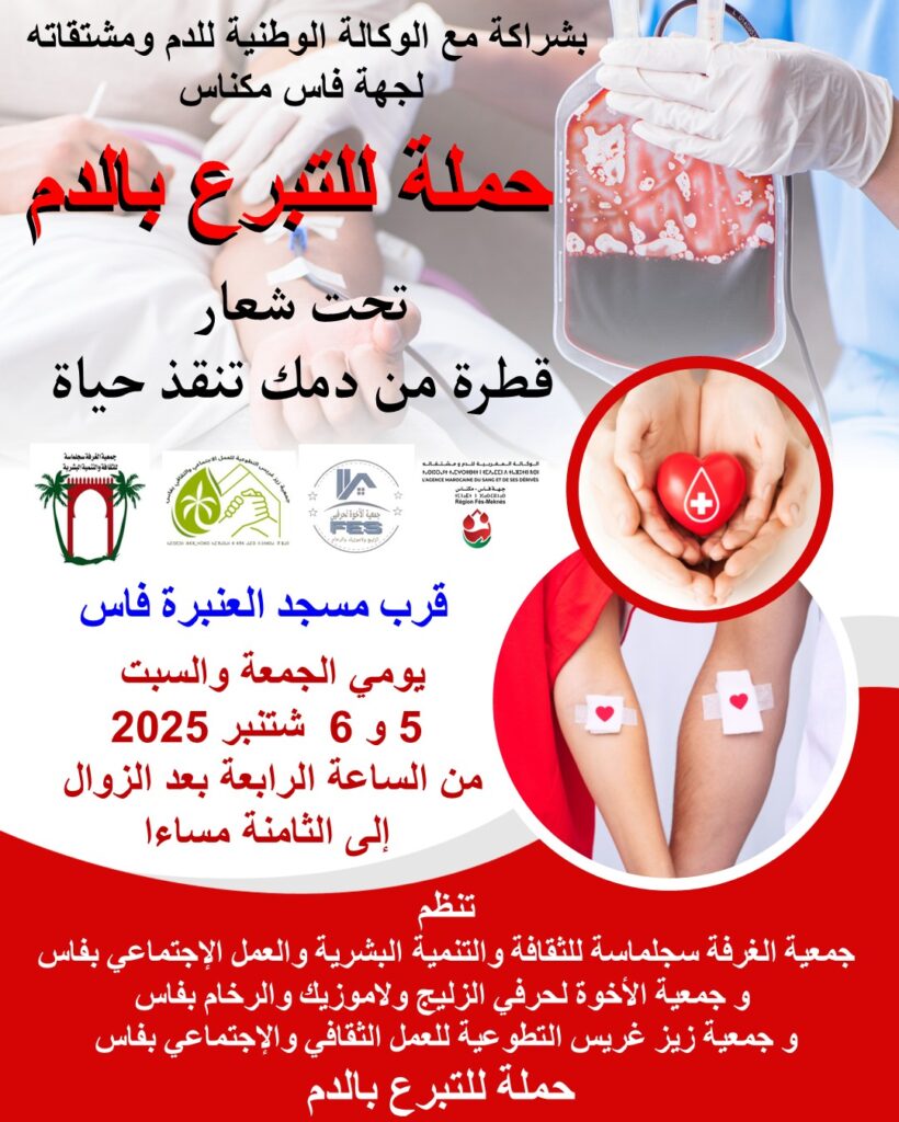 نجاز حملة للتبرع بالدم وذلك بمشاركة جمعية سجلماسة وجمعية حرفيي الزليج والرخام وذلك بإشراف وبطلب من الوكالة الوطنية للدم ومشتقاته لجهة فاس مكناس،الحمد لله الامور تسير باحسن حال ،وهذا إنجاز ينضاف إلى سجل الجمعية بمدينة فاس.
